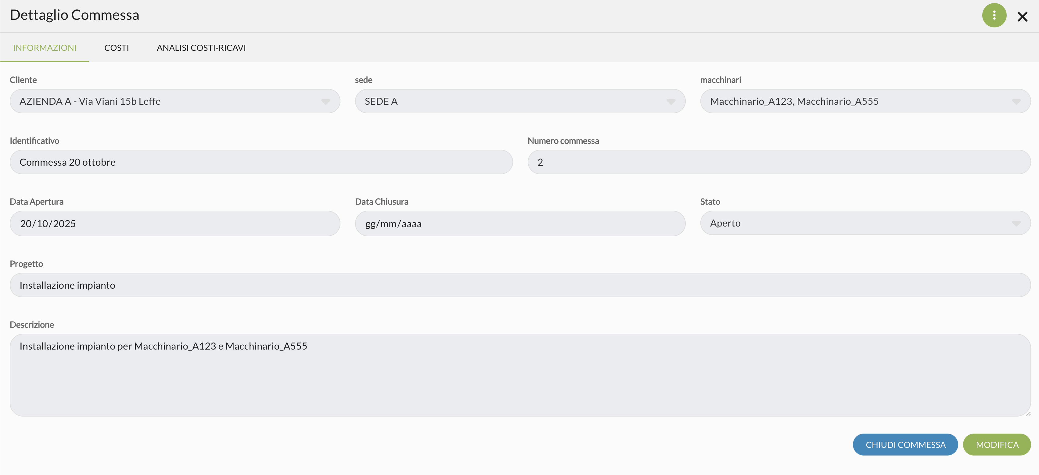 Per creare una nuova commessa occorre cliccare su “+”. I dati richiesti per la creazione di una commessa sono: cliente, sede, macchinari, identificativo, data apertura, progetto e descrizione.