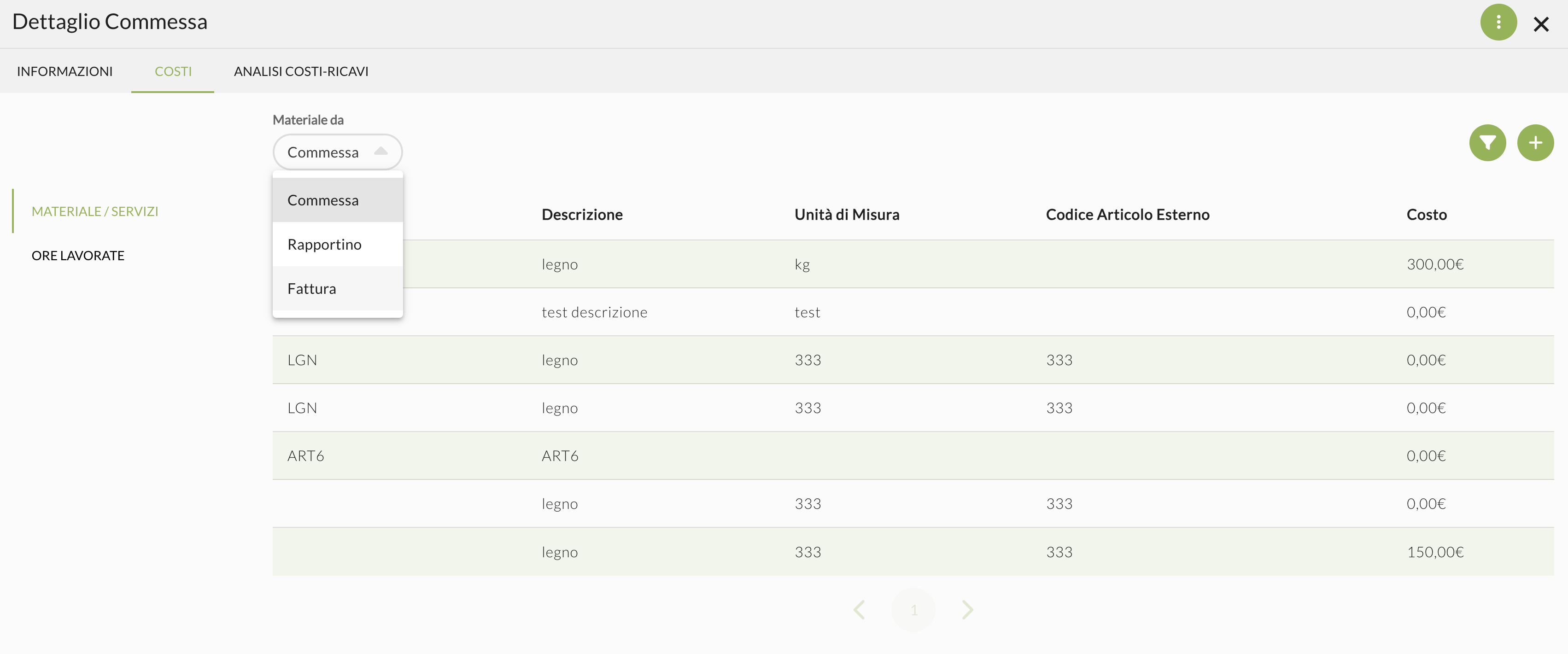 Se si apre il dettaglio di una commessa, è presente la voce COSTI. Da qui è possibile visualizzare i materiali/servizi e le ore lavorate associate ad una determinata commessa. Questi, possono essere visualizzati per Commessa, Rapportino, Fattura.
