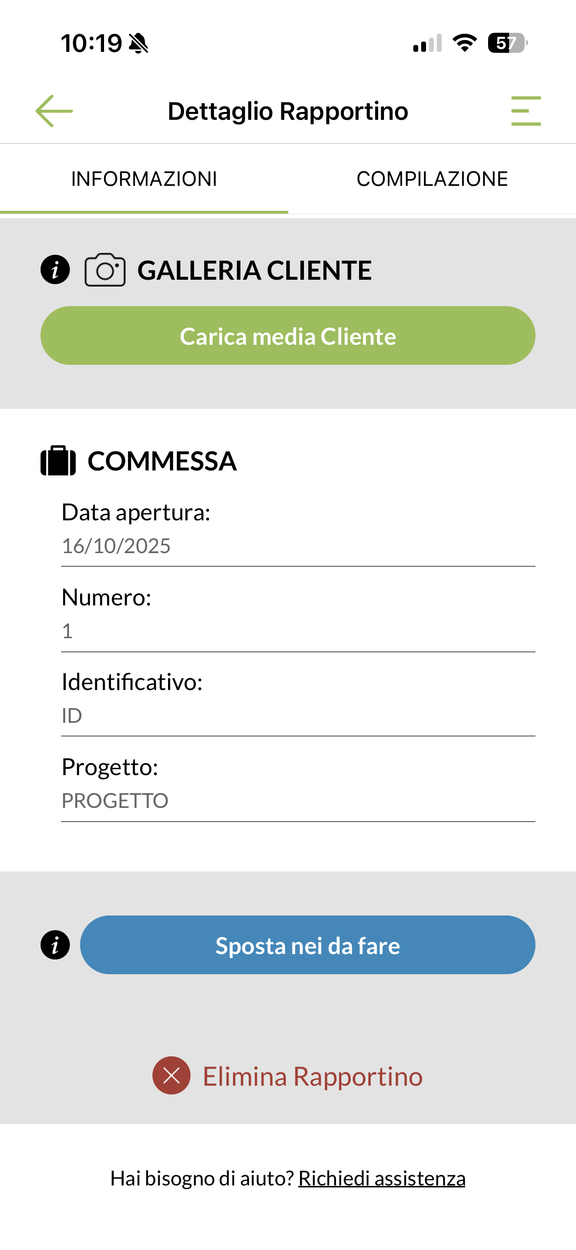 Una volta creato l’intervento, su APP per il tecnico, saranno disponibili le informazioni principali della commessa: