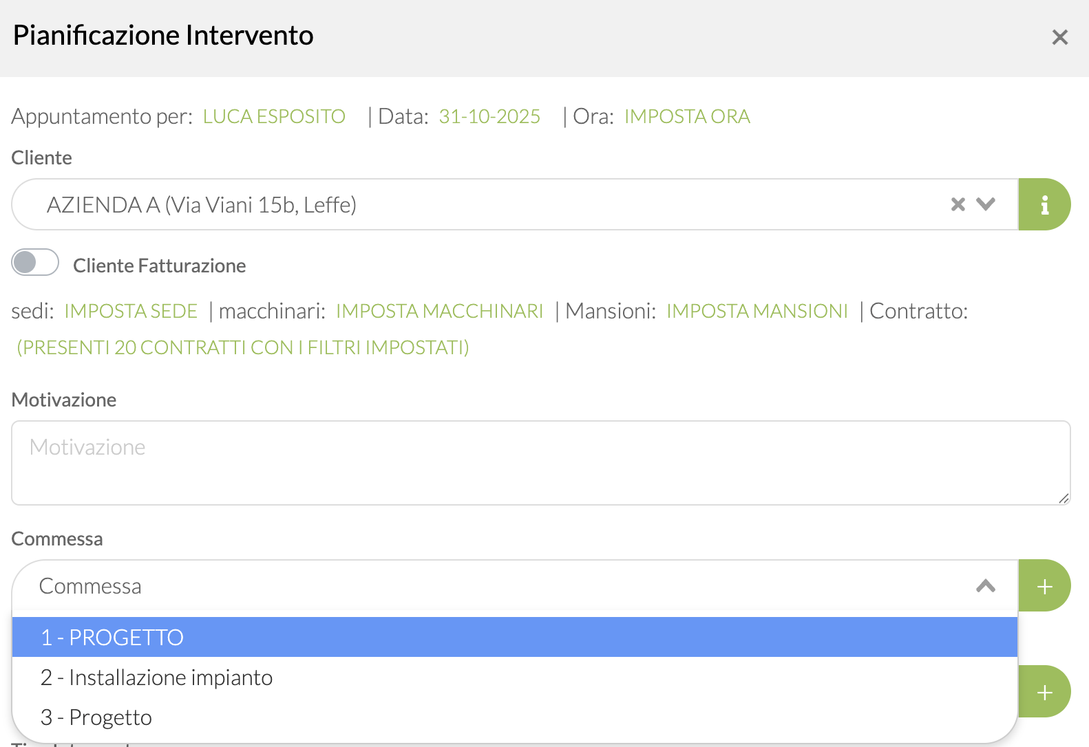 In fase di pianificazione degli interventi è presente la possibilità di selezionare, dopo aver impostato il cliente, a quale commessa associare l’intervento: