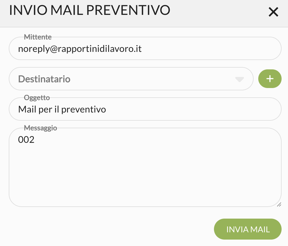 Dopo aver impostato le seguenti informazioni, cliccando su INVIA MAIL, il preventivo verrà inviato ai destinatari inseriti