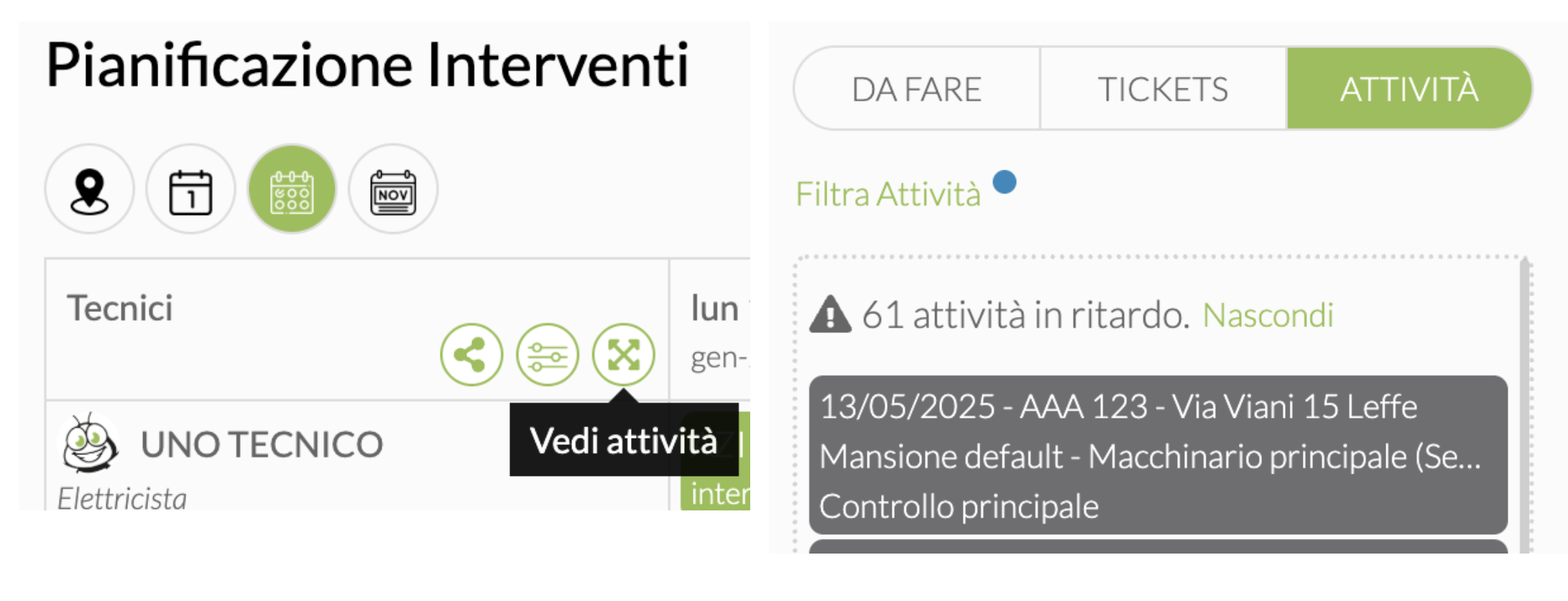 Una volta create le attività, saranno visibili in pianificazione interventi. In pianificazione vengono visualizzate in 2 sezioni: