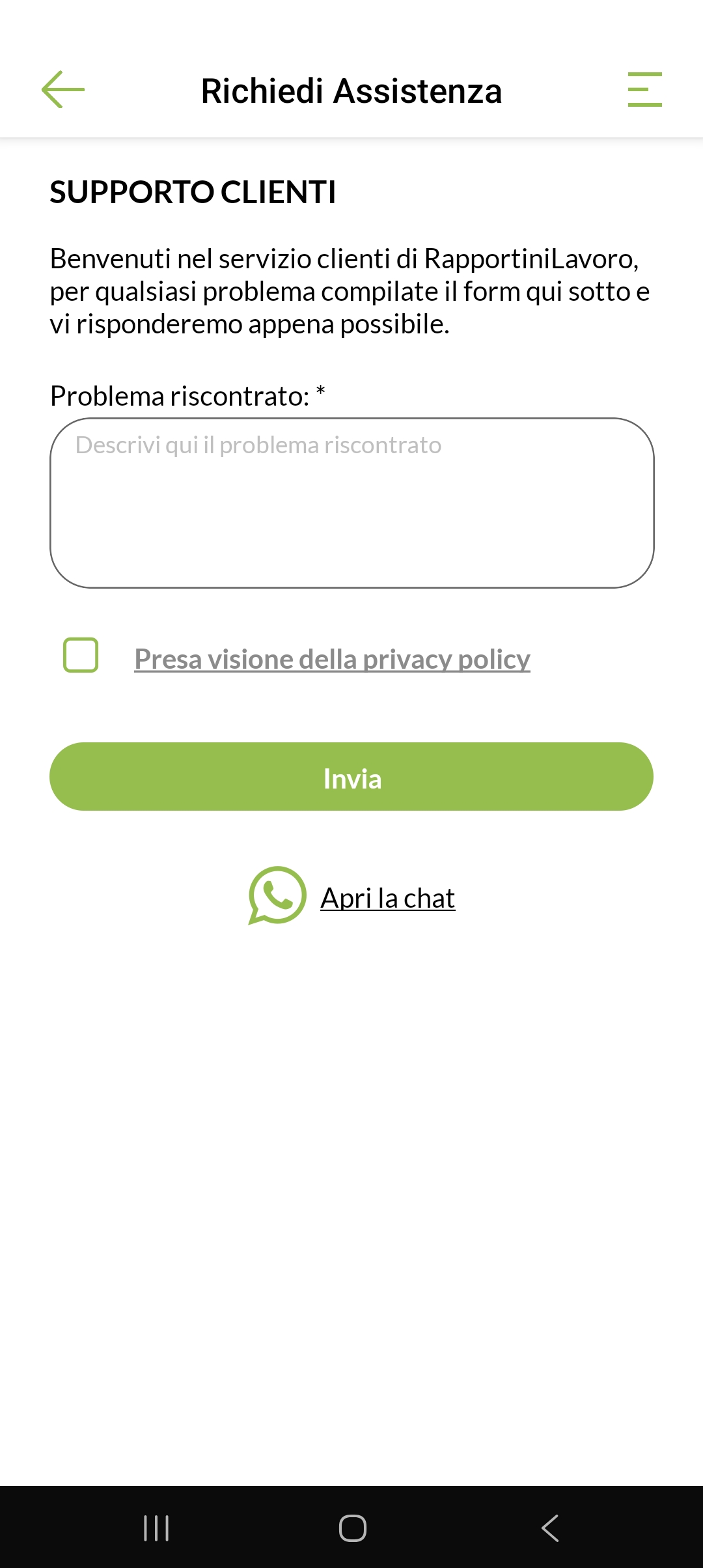 Per inviare al supporto di RapportiniLavoro le informazioni inerenti al dispositivo, è sufficiente accedere alla APP di RapportiniLavoro e andare nel menù.