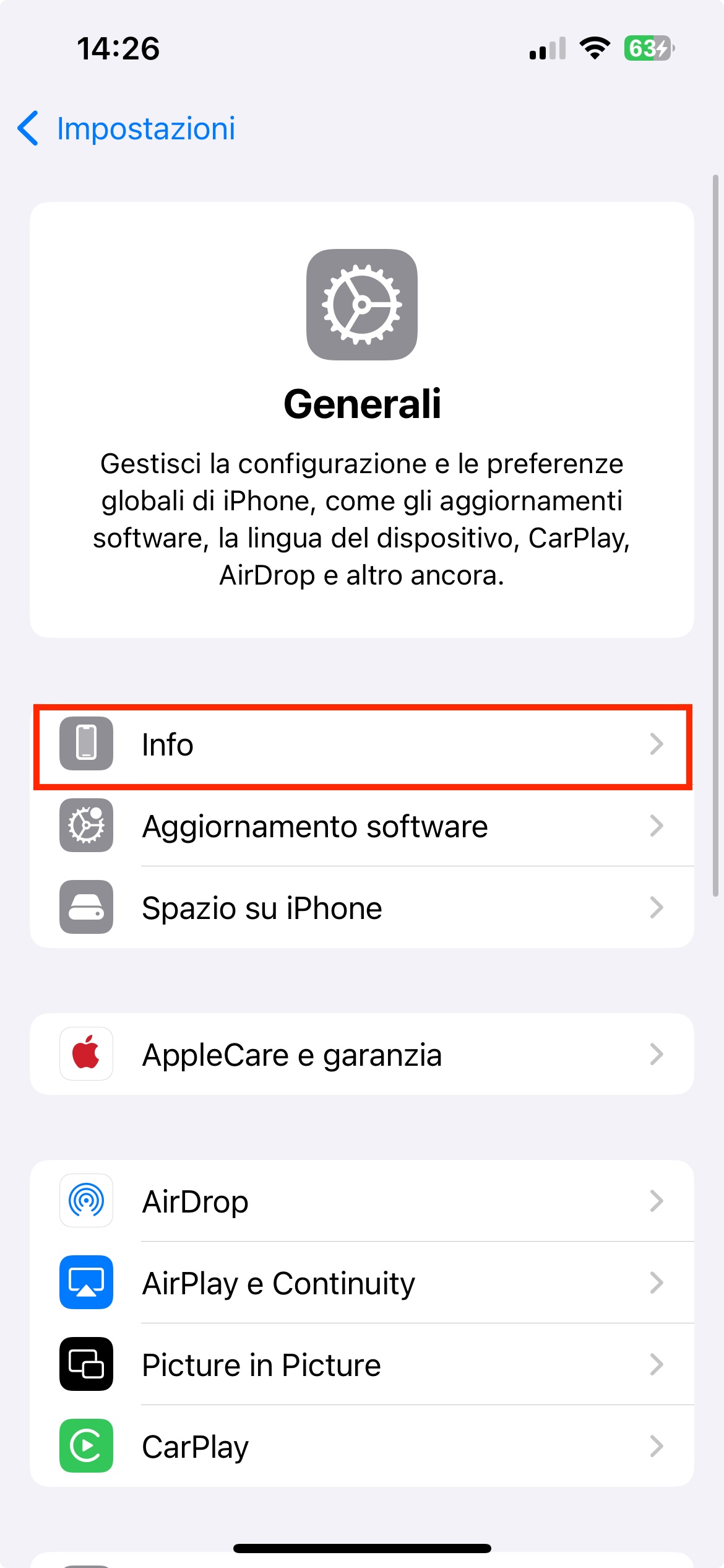 Nella schermata successiva è necessario cliccare su INFO: