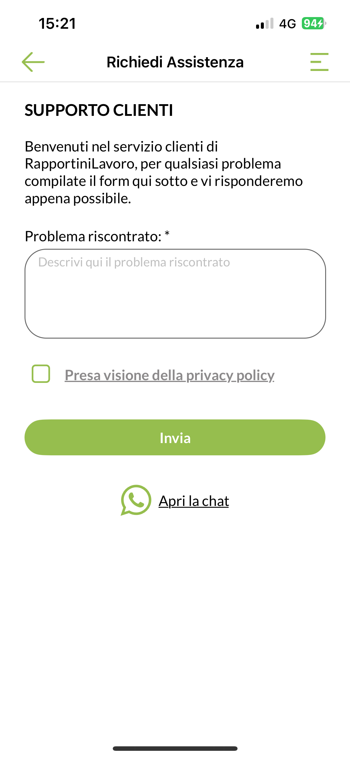 In baso è visibile la sezione “Richiedi supporto”, qui viene aperta una schermata che permette di inserire la richiesta e che invia al nostro team le informazioni del vostro dispositivo: